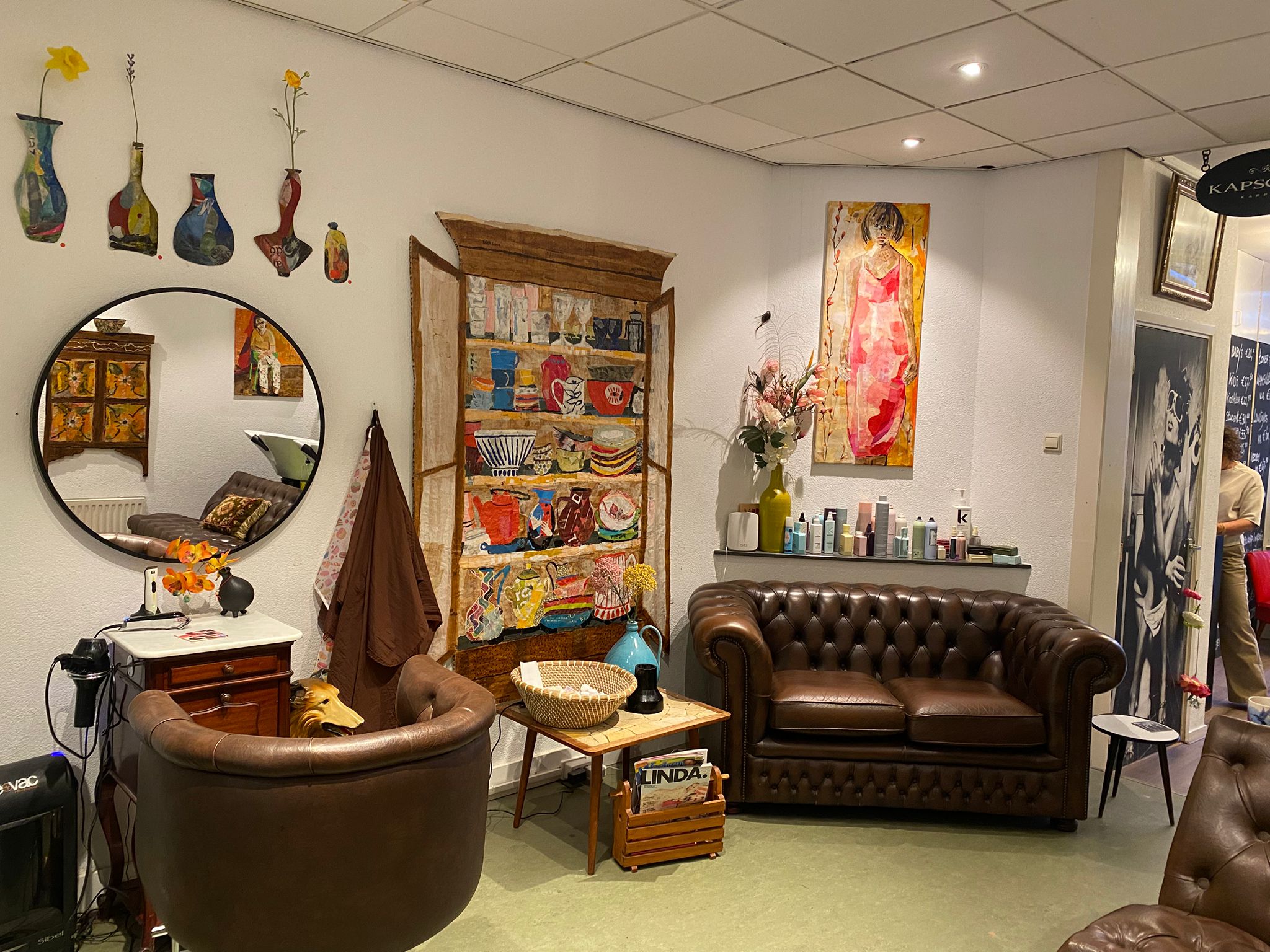 Half oktober is er kunst in kapsones!. Beeldend kunstenaar Astrid Vlasman gaat de voorruimte aan de Doezastraat gebruiken als haar nieuwe werkplaats / atelier. Astrid Vlasman werkt al jaren met gebruikt papier. Haar collages zijn kleurrijk en figuratief. Het is werk waarin mensen en hun omgeving centraal staan. U kunt haar regelmatig aan het werk zien en haar werk zal zichtbaar zijn in de etalage. Loop rustig langs als je achterin de kapsalon moet zijn of wandel binnen als je op zoek bent naar een schilderij of een cadeautje. Ook zullen er regelmatig activiteiten zijn waarin er mogelijkheden zijn om zelf of met een groepje aan de slag te gaan.Het wordt een plek waar veel mogelijk is. Wilt u meer weten over Astrid Vlasman en de activiteiten / workshops die gaan komen, ga dan naar Kunst met kapsones